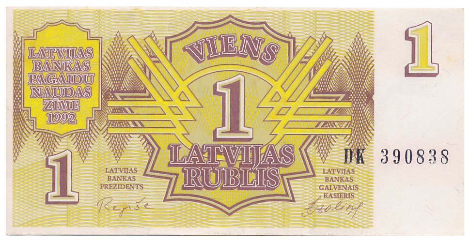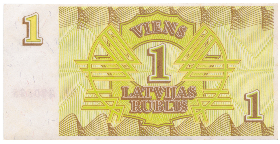 Billete Letonia 1 Rublis 1992 Diseño Simétrico. LatviaBillete 1 Rublis 1992Serial DK 390838Segundos Rublis (1992 - 1993)