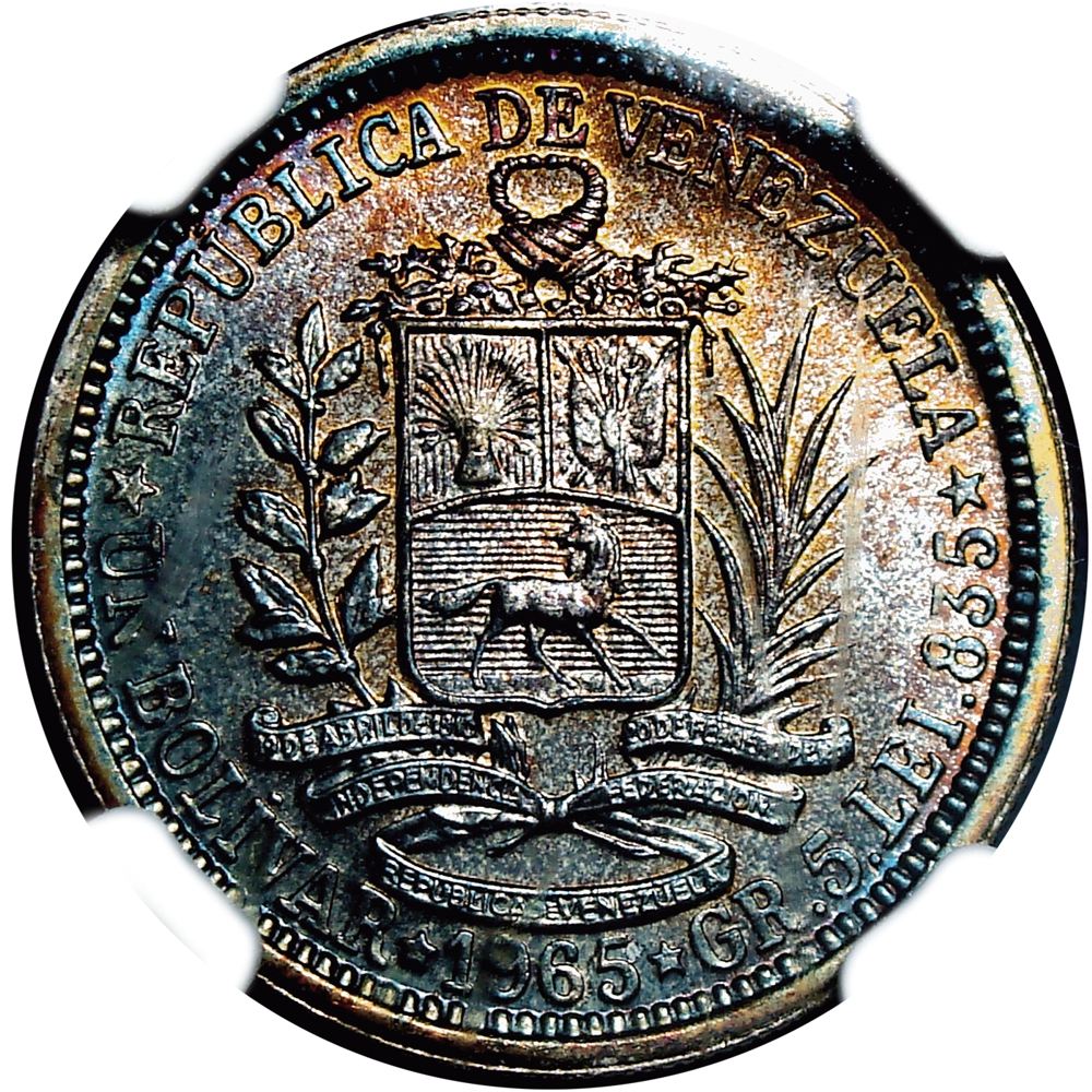 Moneda de Plata 1 Bolívar 1965 Particular NGC MS 66. Venezuela Moneda 1 Bolívar 1965En cápsula NGC MS 66