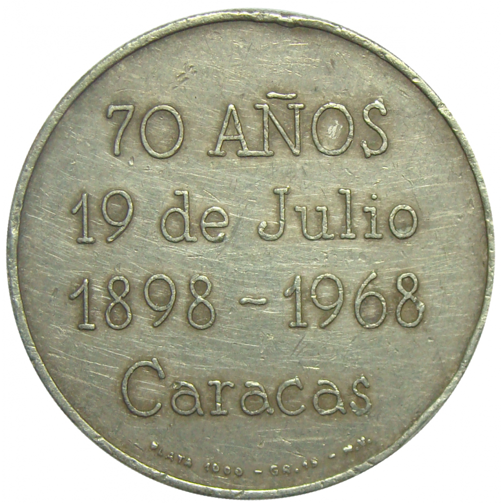 Reverso: En el centro, la inscripción: "70 AÑOS 19 DE JULIO 1898-1968 CARACAS".