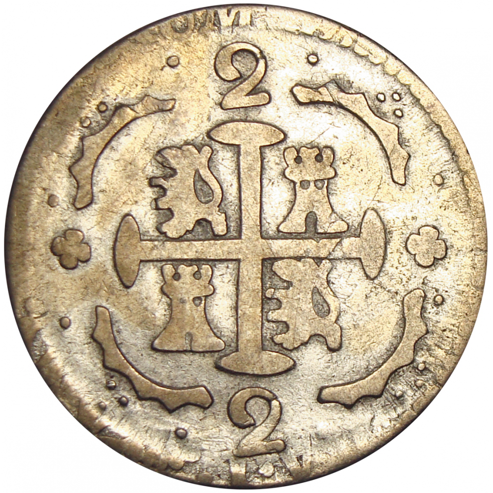 el valor 2 en los brazos verticales. Hay una orla de gráfila.