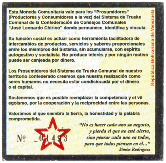 Ficha Trueque Jose L. Chirino 1 Zambo 2007 #1493. Ficha de Venezuela1 Un ZamboN° 01493Sistema de Trueke Comunal de la Confede...