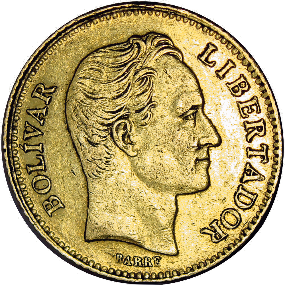 Moneda de Oro 20 Bolívares 1886 Bolívar - 6 alto y alejado. Venezuela Moneda 20 Bolívares 1886Popularmente llamada "Bolí...