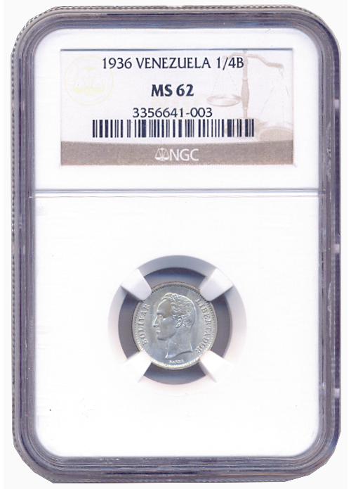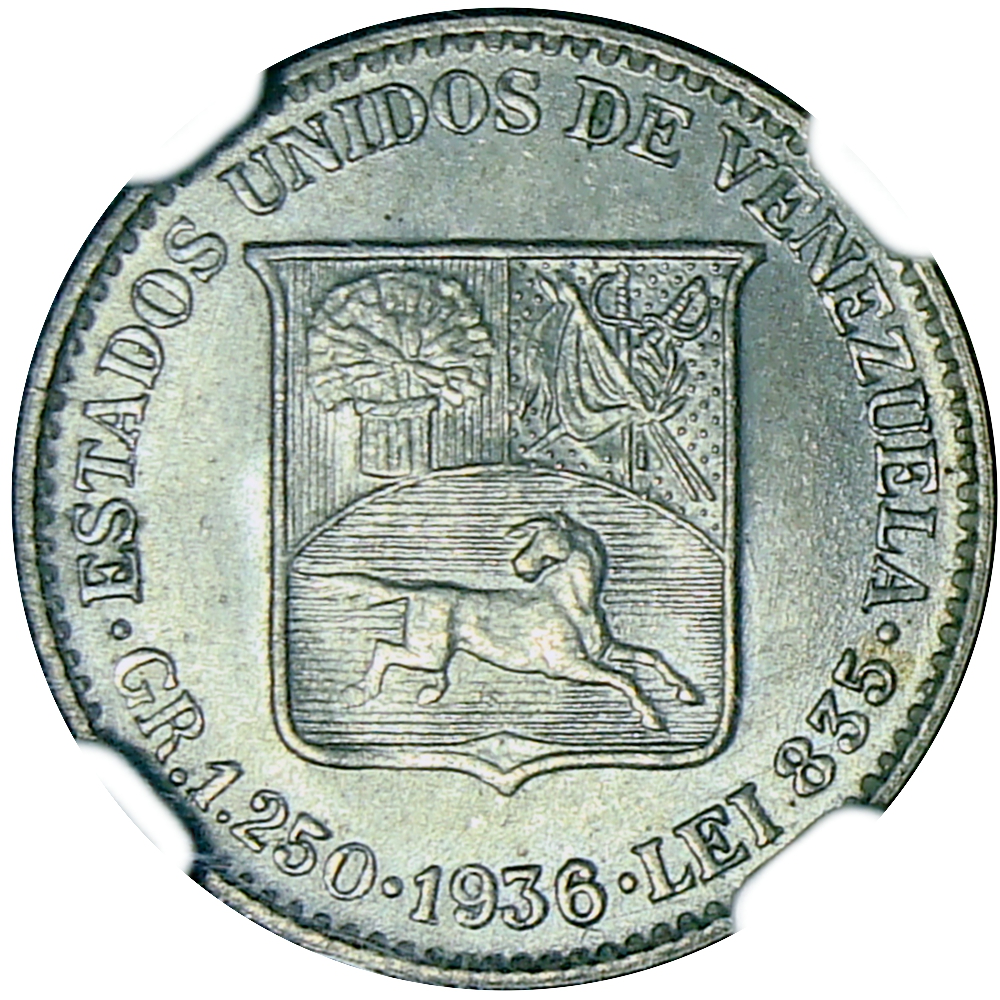 Moneda de Plata 25 Céntimos 1936 NGC MS62 Medio. VenezuelaMoneda 25 Céntimos 1936 Popularmente conocido como Medio, &frac1...